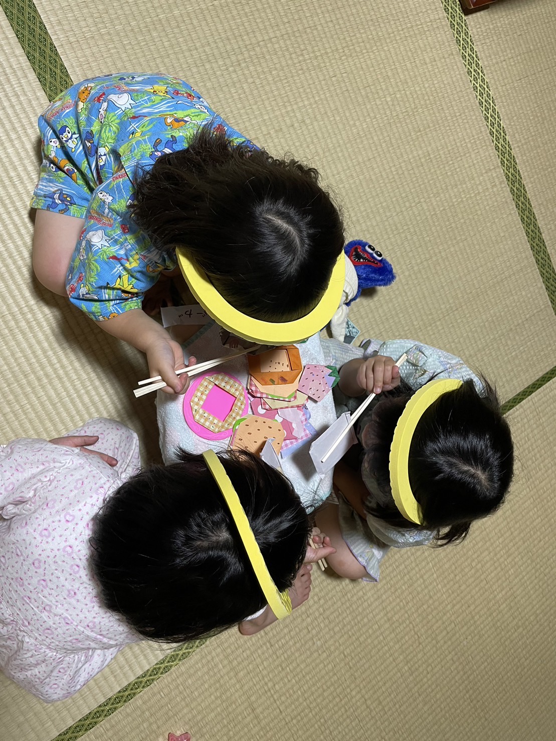 頭に黄色いカチューシャを付けて宇宙人になり、食事会ごっこをしている様子です★