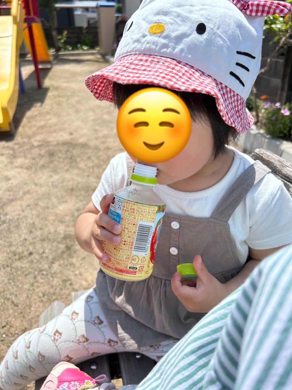 熱中症対策の水分補給にりんごジュースをもらい嬉しそうに飲んでいました。