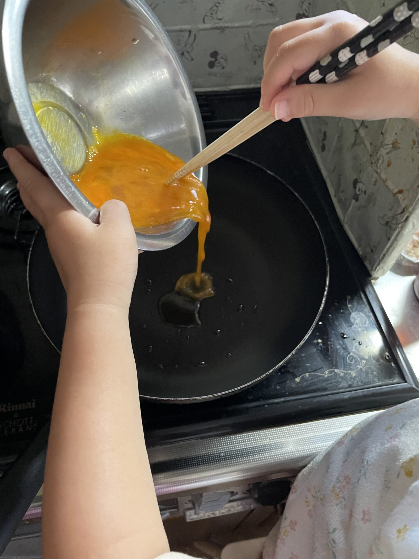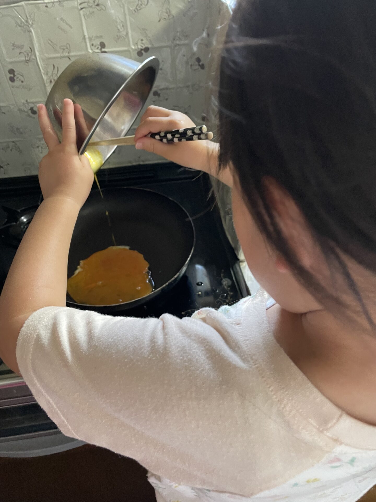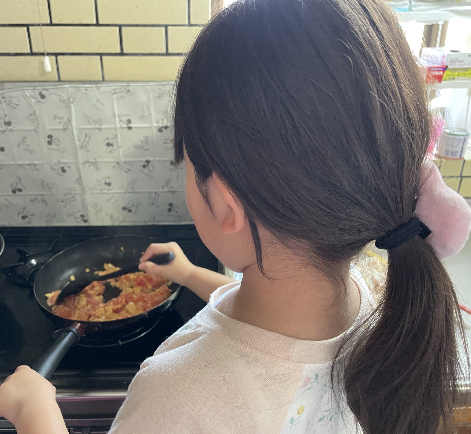 こちらの写真は、夕食のお手伝いで小学一年生の女の子がトマ玉を作ってくれている様子です🍳卵をフライパンに流し込んで~♪