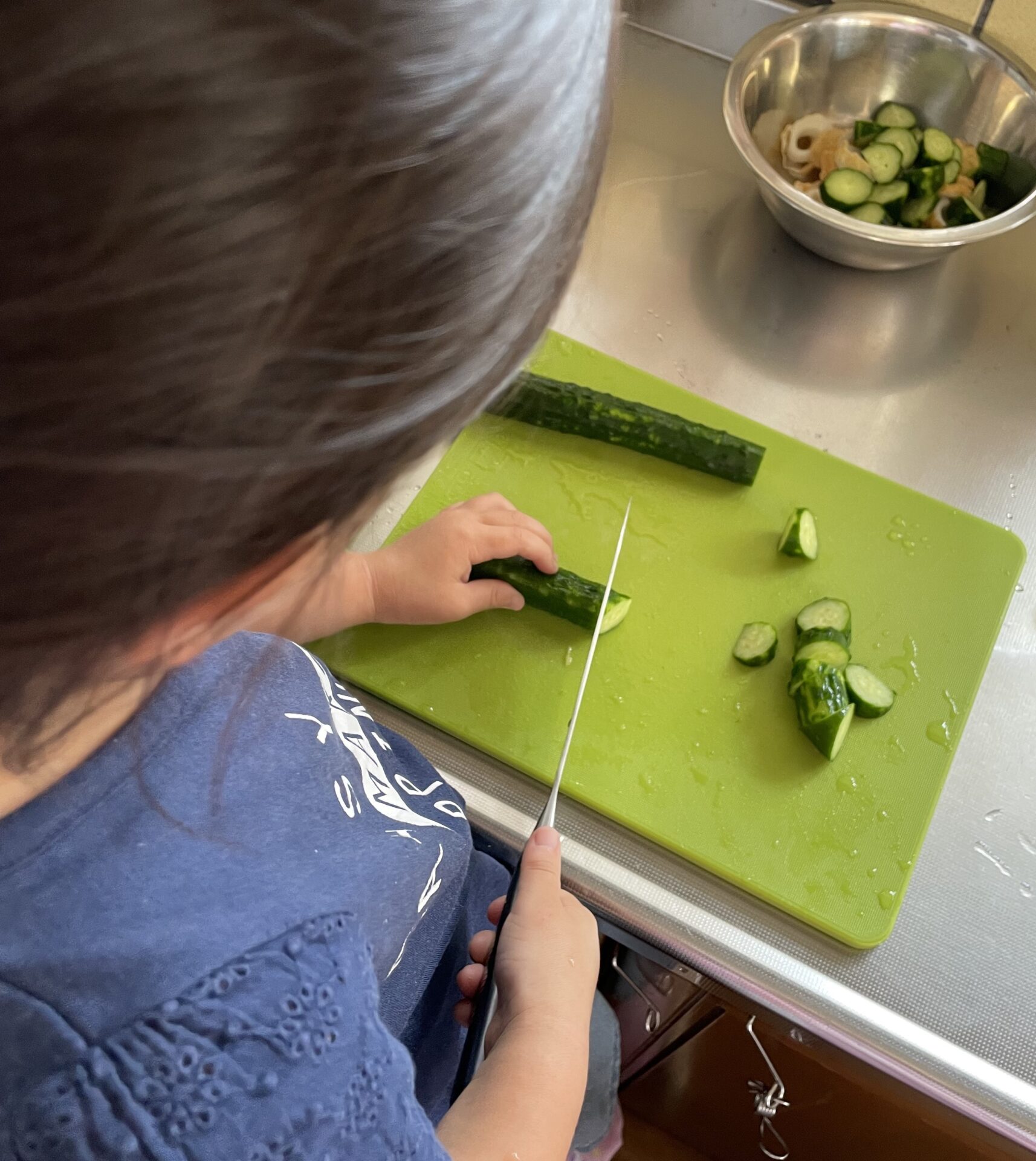 まだまだ包丁には慣れない様子で職員もハラハラドキドキしながら見守りますが、いつもとっても上手に切ってくれます🥒🔪